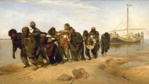 Die Wolgatreidler dagegen sind einzeln in breiten Riemen angeschirrt und schleppen mit größter Mühe einen Lastkahn ans Ufer. Dieser wird dort entladen und hat den Rest seines Schiffslebens noch vor sich.