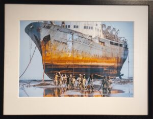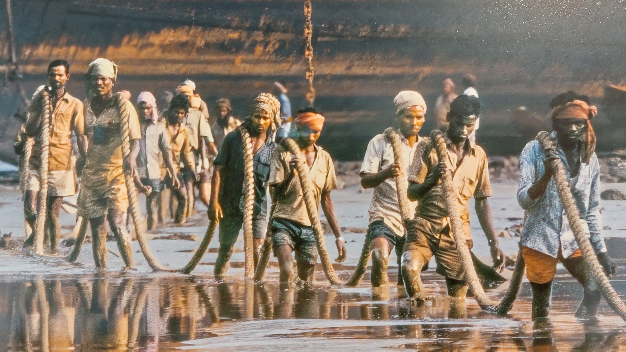 Ich hatte nicht geahnt, dass es solche Männer wie Repins Wolgatreidler noch gibt. Rolf Nobel ist ihnen in seiner Fotoreportage im indischen Alang sehr nahe gekommen. Das Tau, das die Männer rechts geschultert haben, hängt zwischen ihnen durch. Es wird an Land gebracht, wie auch die schwere Schiffskette, während der Koloss schon feststeckt zum Abwracken.