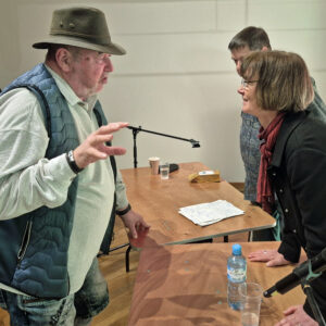 Zwei Mikrofone. Beim Soundcheck schiebt der Tonmann die Regler routiniert auf seinem Tablet. Leif kommt etwas später, wird umringt. Tennemann zieht Leute an.