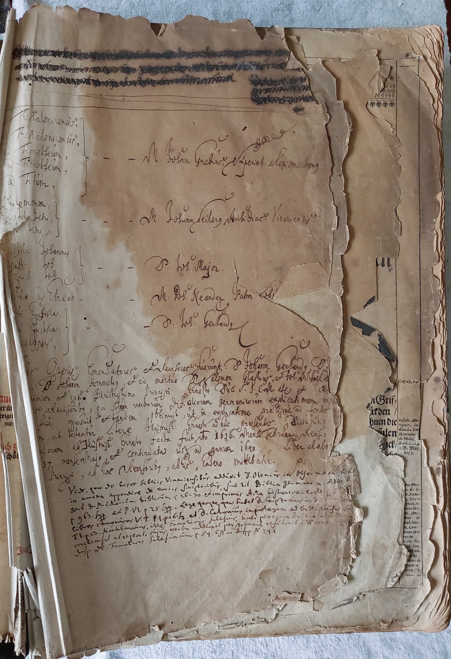 Das Vorsatzblatt der Familienbibel hängt nur noch an wenigen Stellen fest. Am zerknitterten Rand – abgegriffen, abgeknickt, abgerissen – fehlen ein paar Fingerbreiten. Dabei ist gerade dieses fragile Blatt interessant wegen der handgeschriebenen Einträge, deren erster so alt ist wie die Bibel selbst. Der 30jährige Krieg war gerade vorbei.