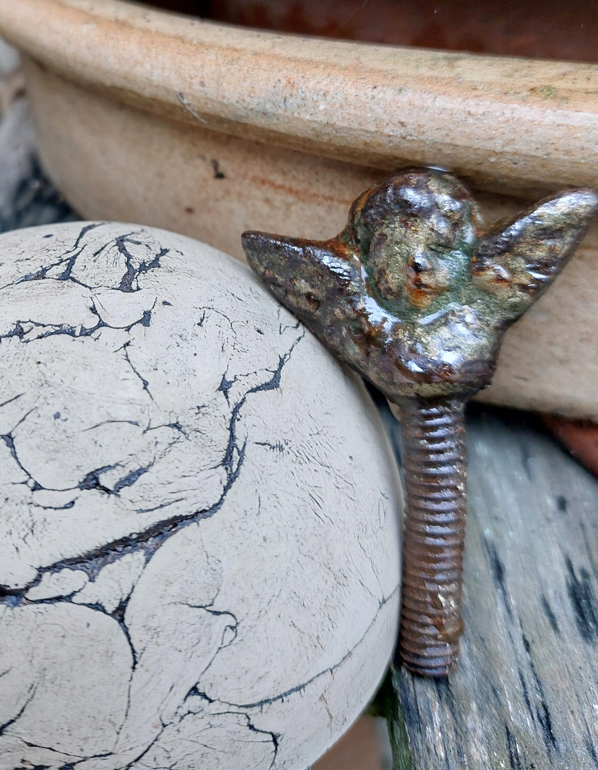 Im August fand ich im väterlichen Werkzeugschrank neben vielem anderen eine sehr besondere Schraube. Eine Flügelschraube, sagt man. Mit gusseisernen Feder-Flügeln. Wo konnte wohl das Gewinde hineingedreht werden? Ich pustete den Staub vom Knauf und blickte plötzlich in ein halbes Gesichtchen mit Nasenspitze, Mundwinkel und tieftraurigem Ein-Auge. Die andere Kopfhälfte war zugesetzt von irgendwas und verriet mir auch nichts über die Herkunft dieses – – – ja, genau, dieses Engels!